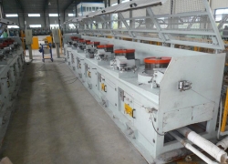 14、交流變頻直線式拉絲機電氣控制系統:本系統采用變頻器調速,PLC程序控制器集控的方式,實現數字化自動化控制。機臺上每個頭都有啟動、停止、點動按鈕、張力氣壓調節;機臺前緊急停車拉繩。觸摸屏上有速度顯示與調速,重量或者長度設定或解除。運行機臺號,運行電流(觀察電流大小可以清晰知道模具磨損狀態),運行頻率(觀察頻率大小可以知道實際最大工作速度),每個頭的功率。觸摸屏上輸入實際運行的模具,可以直觀的顯示每道次的減面率,避免不合理的拉拔,通過觀察電流的波動可以發現并調整損壞的模具避免生產廢絲!系統還具備一些特色功能:穿絲點動永不斷絲功能,高速運行中斷絲自動緊急停車功能,遠程監控檢修功能。所以高自動化智能化的電氣控制系統是高效低成本高質量拉拔低碳鋼絲的最先進技術。